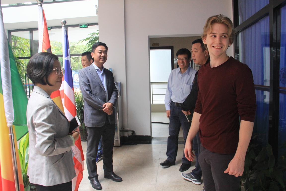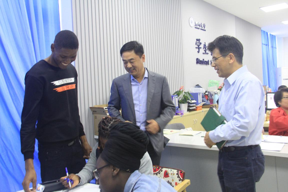 (留学生教育与管理部)院长兼书记叶苗教授、副院长陈军、副院长包含丽的陪同下,来到学生事务大厅了解迎新工作进展,并与多位新生亲切交流,询问学生相关信息,鼓励他们尽快适应留学新生活,他还对接下来的国际学生工作做了进一步的安排和部署。