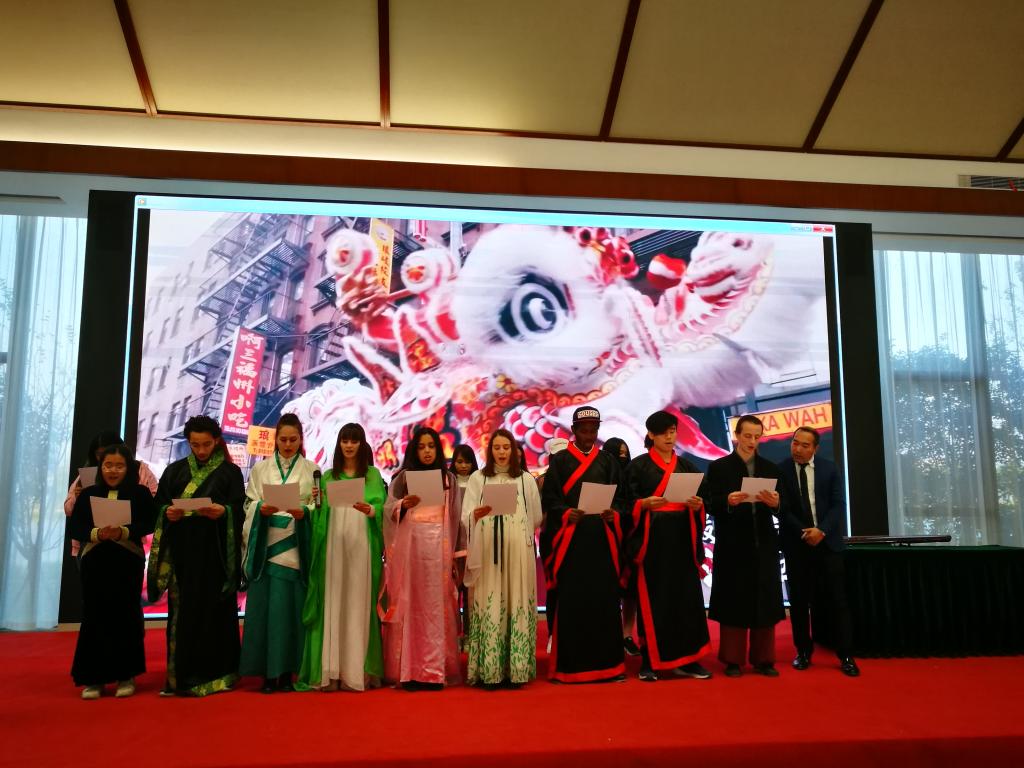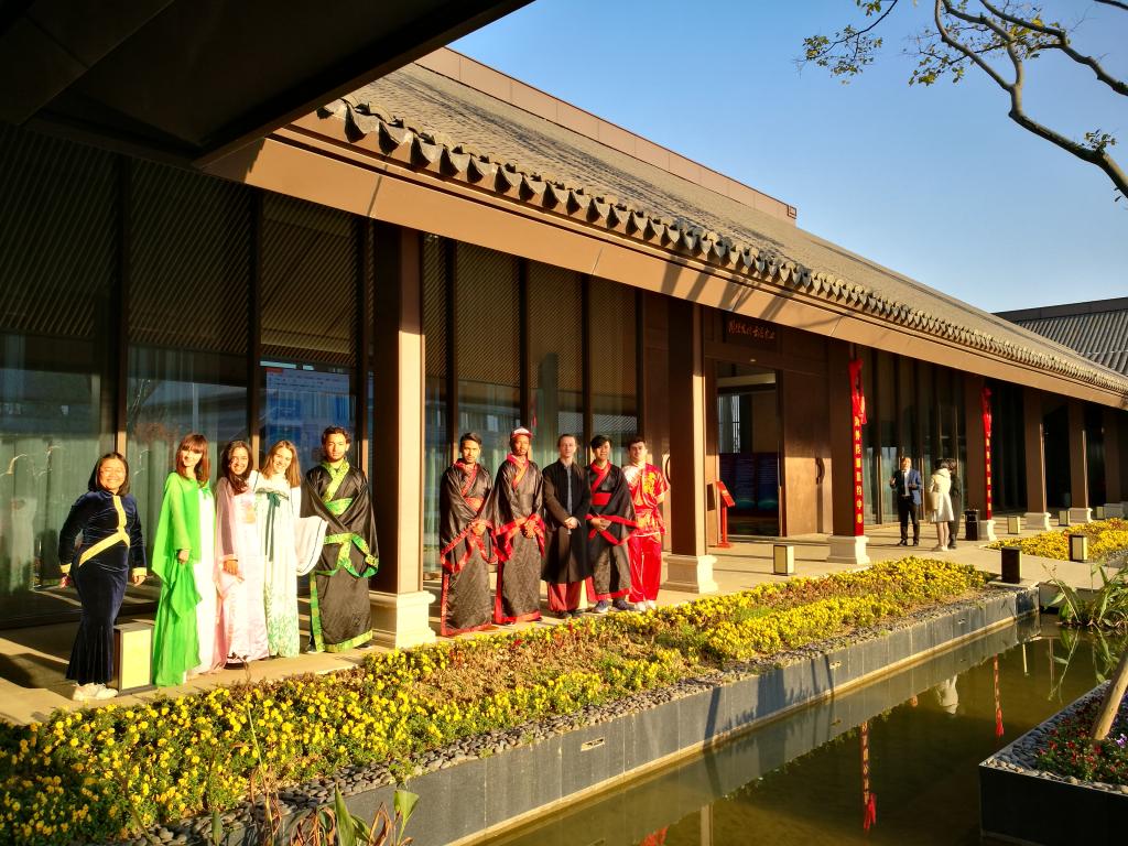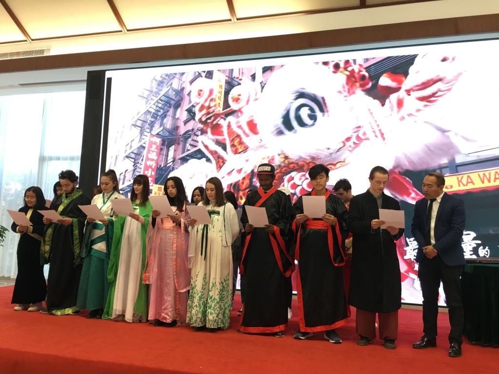 在授牌仪式上,来自法国、意大利、埃及、孟加拉国等国家的国际学生在基地的国际文化交流厅进行了中国功夫、古琴演奏、剪纸、《论语十则》、《茉莉花》等传统文化项目的表演排练。“子曰:‘学而时习之,不亦说乎?有朋自远方来,不亦乐乎?人不知而不愠,不亦君子乎?’”国际学生们身穿汉服,大声诵读《论语十则》中的内容,切身感受中国传统文化的魅力。来自意大利的LIVRANO MARIANA还在现场用手机与万里之外的父母视频连线,让他们感受现场的热闹氛围。今后,国际学生们将经常走进七都,走进市海外传播示范基地,学习中国文化,开展中外文化交流活动,向世界宣传温州,宣传温大。