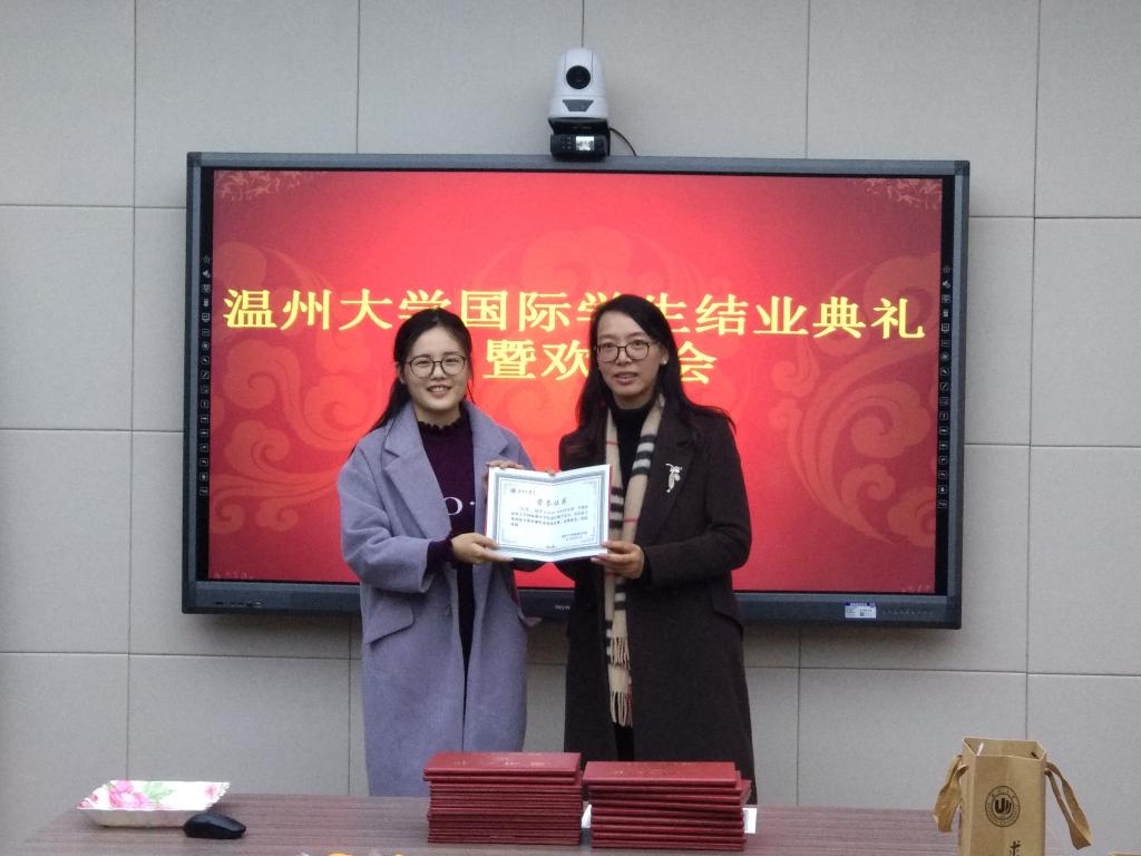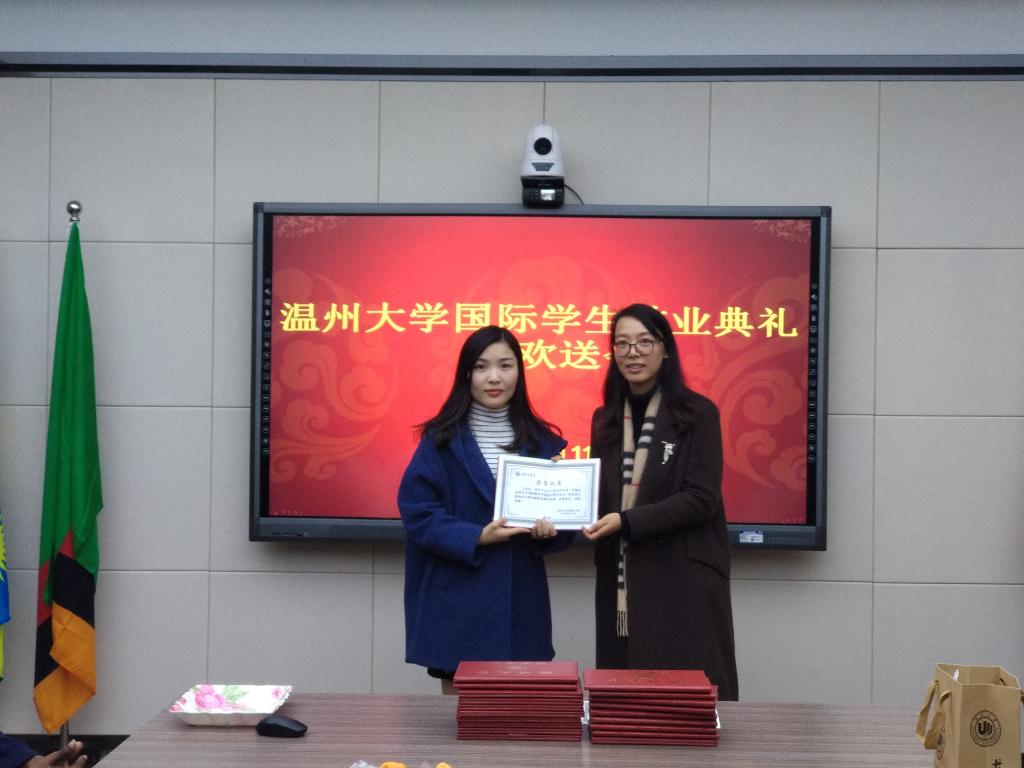 纪念品,为来自韩国、意大利、尼日利亚的结业学生颁发校友联络员证书,并为两位实习老师颁发“优秀实习教师”证书。她提到,希望各位校友联络员积极地与学校及各国校友联系,在自己的国家组织校友开展活动,将温大精神传播到世界各地。同时,她希望各位结业学生努力学习汉语,向自己的家人和朋友讲述中国故事,讲述在温大的故事。希望各位结业的“温大人”常回家看看,“温州大学是你们永远的家”。