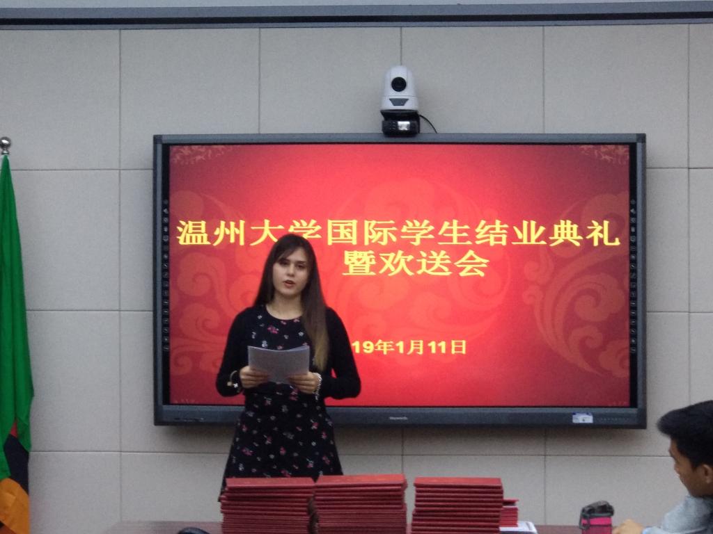 会上,张珉璐老师作为教师代表发言,她说,“很高兴在这里和你们相遇,并在这里共同成长,共同进步。”她列举了三个国外名人学习汉语的案例,激励国际学生们坚持不懈攻克汉语言难关,学说中国话。意大利籍交换生李马莲作为结业学生代表,用中文讲述了她在温大学习生活的切身感受。“刚来温大的时候,我对这里的饮食和气候还不熟悉,怀念意大利的家乡菜,但是后来竟慢慢爱上了这里,爱上了温州菜,经常和朋友出去品尝不同种类的特色美食”,李马莲说她参加了国际文化周、汉服文化体验等活动,“老师们也很善良,耐心教导我们每个汉字的含义,我衷心地感谢学校的领导和老师们。”她的同学许弘文说到,“我今年寒假就要离开温大回到意大利了,非常感谢学校和各位老师,在这里学习的经历将会给我一生中留下最难忘的回忆。”
