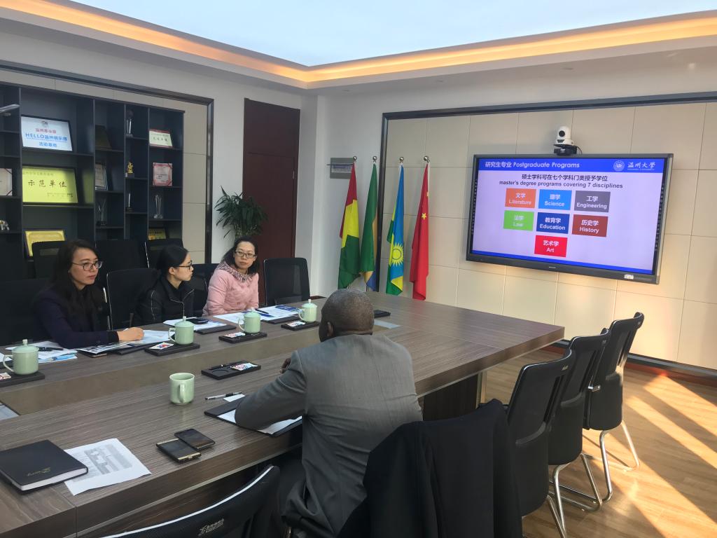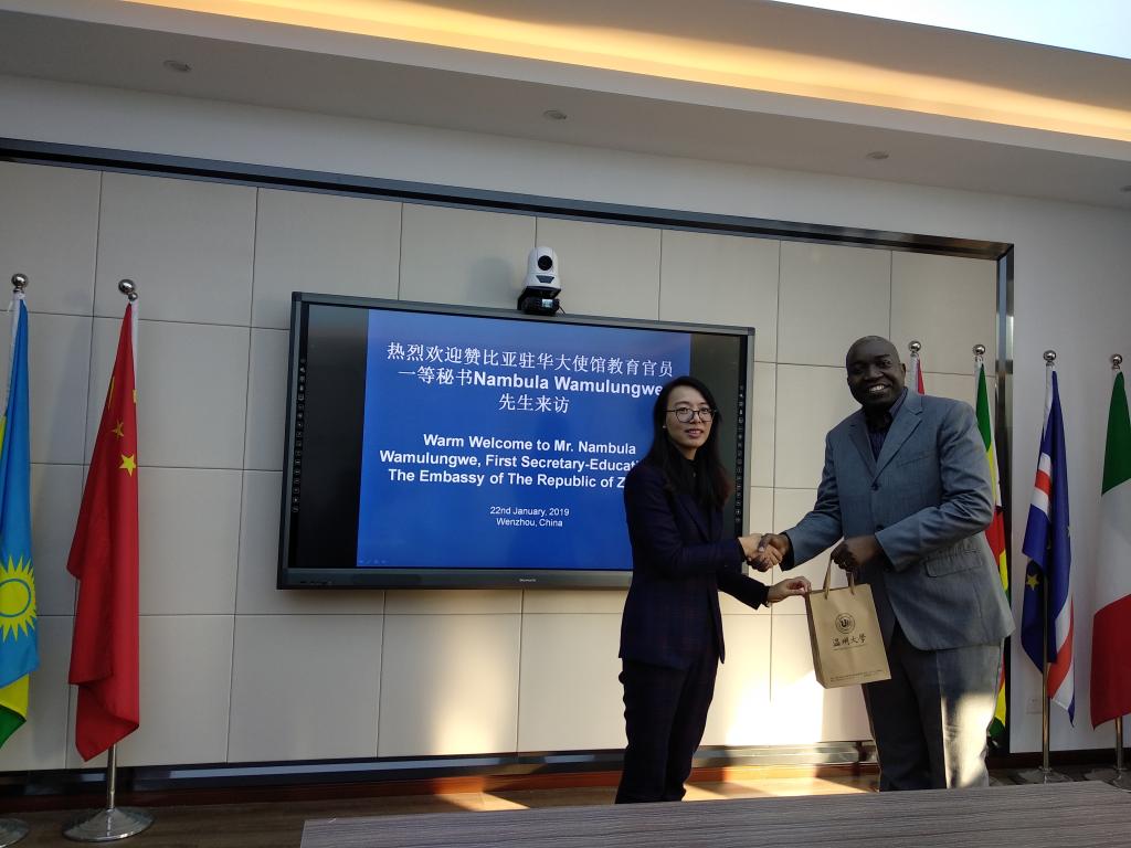 包含丽副院长对Nambula Wamulungwe的来访表示欢迎,她介绍了温州大学的办学基本情况和我校国际学生教育情况,并就赞比亚学生的在校情况与大使馆教育官员作了交流。使馆教育官员对我校校园环境、办学条件、硬件设施给予充分肯定,并希望通过此次访问进一步加强中赞文化教育交流,推荐更多当地优秀学子来温州大学就读。