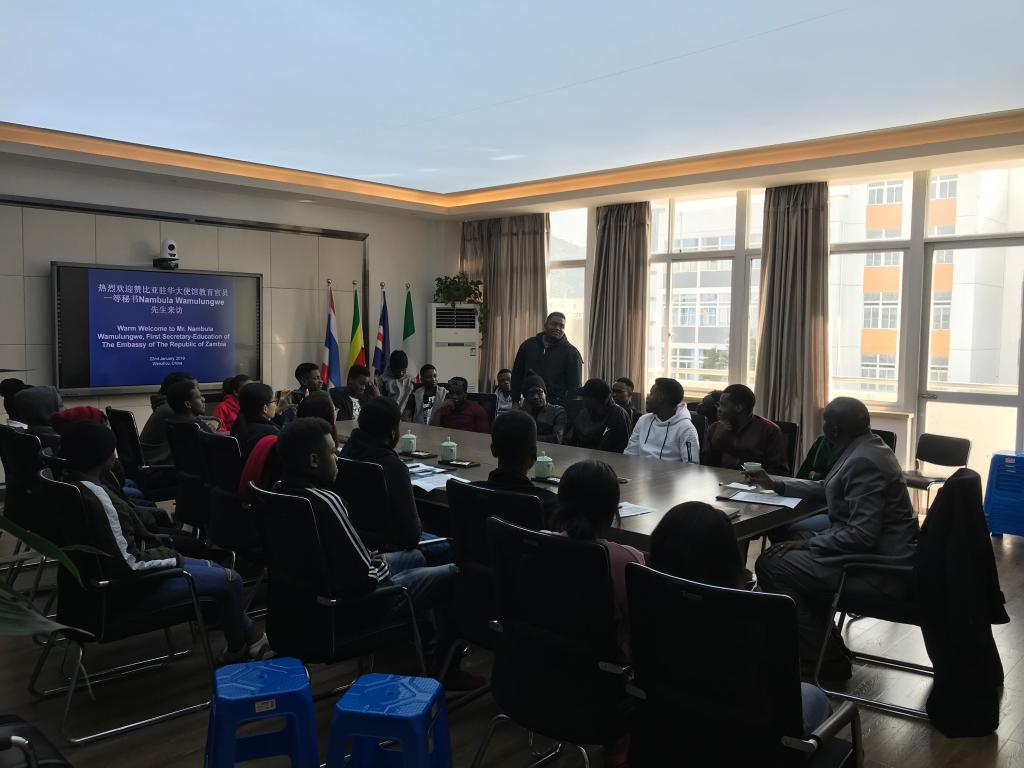 同时,使馆教育官员还和我校赞比亚籍的29位国际学生进行座谈交流,了解该国学生在校的学习、生活和行为表现情况,向他们重申在中国学习和生活需要遵守的法律法规,鼓励他们珍惜在华留学的机会,在自己的专业学习方面学有所成。