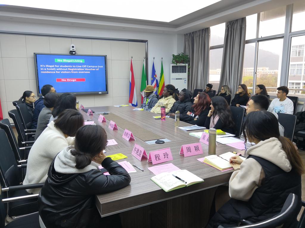 会上,相关部门老师对中国相关法律法规、校纪校规、招生制度进行解读。学生科钱江潮老师作中国法律和校纪校规宣讲。他强调了非法打工规定、宗教活动管理,讲解了校纪校规、请假制度以及校内外住宿管理制度,通报了开学初国际学生的考勤情况。谢坚老师解读了“温州大学汉语生入学奖学金”申请条件及评选程序。招生办池轶文老师作招生宣传动员,对我校国际化本硕专业、学历生招收条件、入学申请程序等进行说明。陈文远副书记就短期生的学风会风、寝室表现、用电安全、校外住宿规定等方面作纪律强调,她指出,要把他们的行为表现评价与汉语生的结业证书、与语言生续读及学历申请、与交换生的成绩认定结合起来,进一步严格短期生的日常管理。与会学生还与相关科室老师就学习、生活方面的困惑进行互动交流。