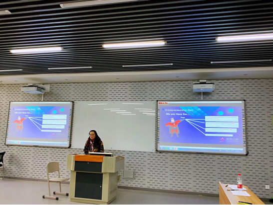 副院长包含丽老师主持。在宣讲会中,跨贸小镇留创园项目经理褚虹、朱婷婷分别就跨贸小镇外国来华留创园基本情况、2019外国来华留学生创新创业大赛和2019外国来华留学生创新创业大赛赛事注意事项进行了详细介绍。其中着重讲解了创业园对留学生创业的各项优惠扶持政策。