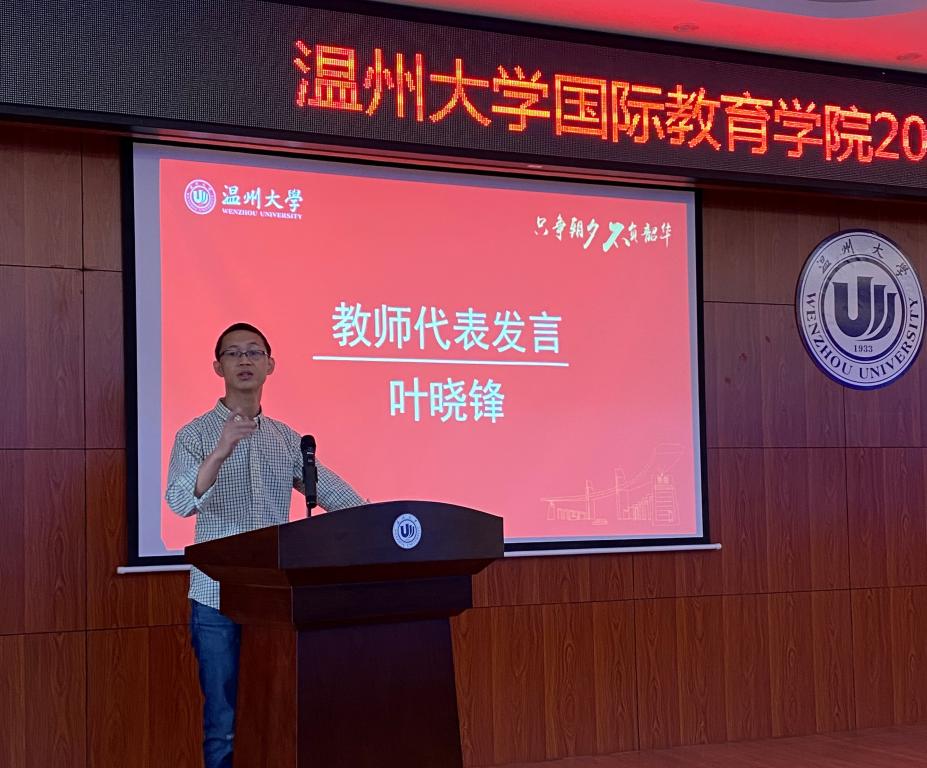 特聘教授叶晓锋博士作为教师代表发言,叶老师指出汉语国际教育专业学生不仅要有扎实的专业素养,更要有开阔的国际视野。要牢记习近平总书记嘱托,树立“四个自信”,努力使自己成为一个具有爱国情怀的汉语国际教育专业人才。