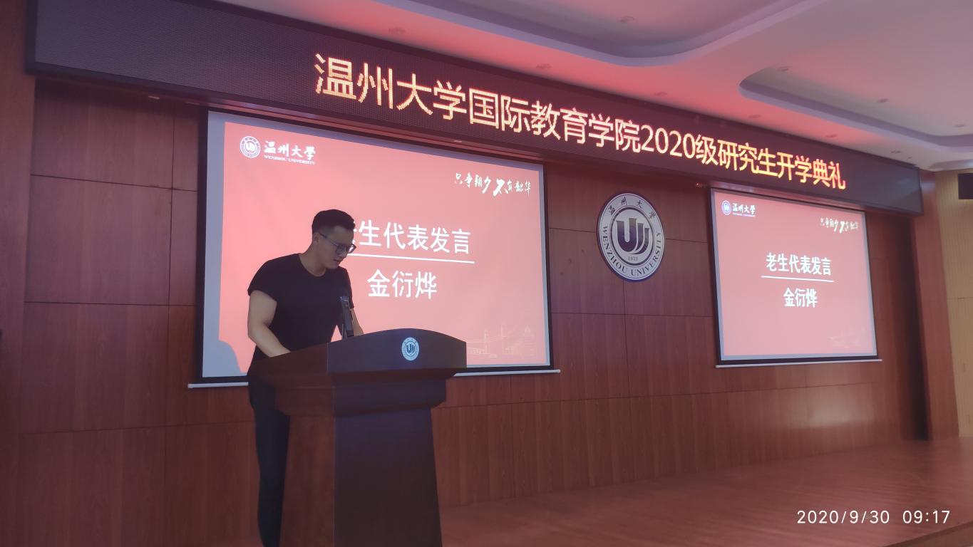 19汉语国际教育班金衍烨作为老生代表和大家分享自己的研途心得。他认为同学们应该明晰自己的目标,并坚定不移走下去。