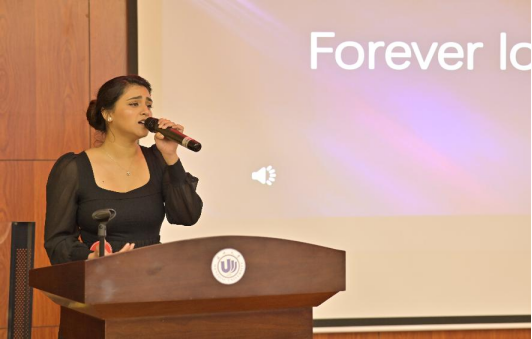 接下来,朗诵组的金微微同学以“尊重知识,尊重人才”为题,向我们传递出知识是宝藏,是科学的旗帜,人才是国家生产力等的道理。而怀揣着浪漫情怀的安纳斯,动情地讲