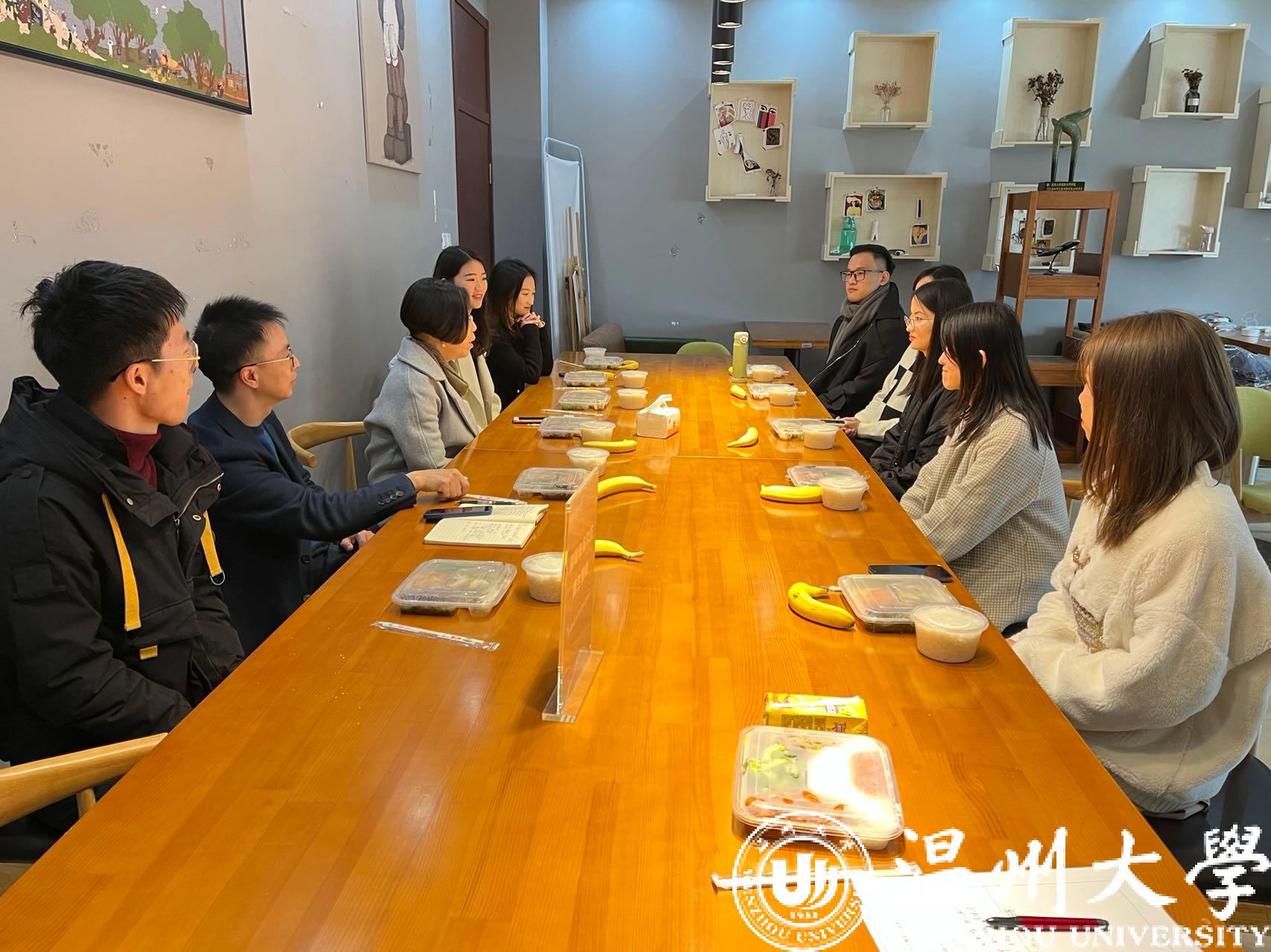 院长叶苗、党总支副书记方建晓、辅导员吴铨铨、钱江潮及8位汉语国际教育专业研究生代表围坐一堂,相约餐叙。