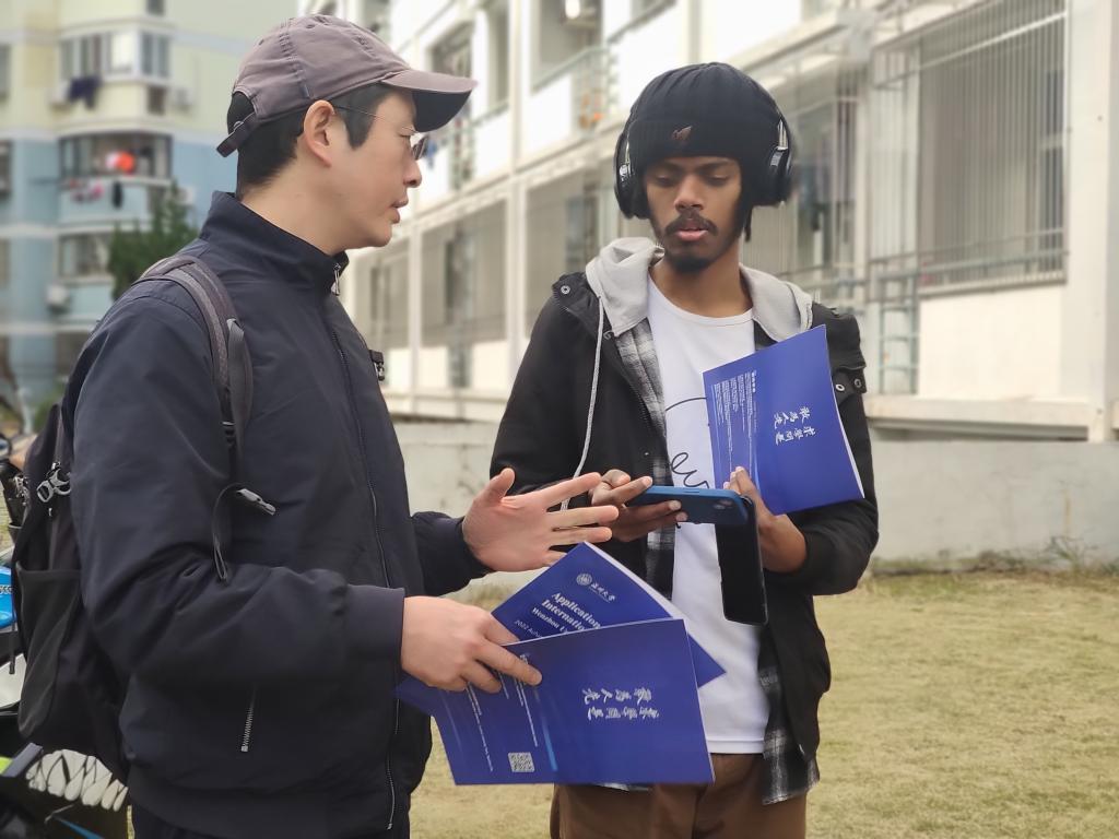 党员们手里拿着《Application Guide for Inernational Students Wenzhou University》小册子,深入国际生寝室,向国际生详细介绍了温州大学国际生的招生政策,涉及硕士项目、本科项目的招生情况以及相关博彩平台排名