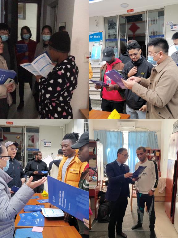 12月22日支部党员们在党总支书记林爱菊带领下奔赴留学生宿舍D区,走进寝室,向国际学生宣传温州大学国际学生招生政策,把招生简章发放到国际学生手中,现场讲解,进行了一场别开生面的主题党日活动。