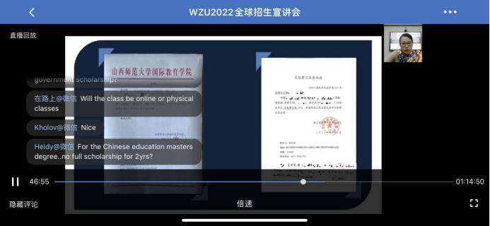 12月23日下午,由留管部组织的“WZU2022全球招生宣讲会”在企业微信线上会议室顺利举行,直播现场设在北校区3号楼博彩平台排名