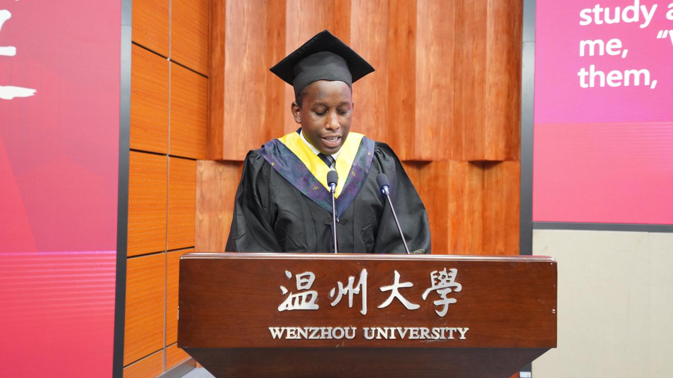 来自坦桑尼亚的2018级算机科学与技术专业学生陆求是代表本科生发言,他说,“不管哪种选择,我们都会秉承温大求学问是,敢为人先的精神,做好母校的大使,坚持为两国的友好发展而努力。”随后,研究生代表、来自意大利的2019级应用经济学专业学生艾兰,从意大利发来祝福视频,表达了对母校温州大学的感激之情。