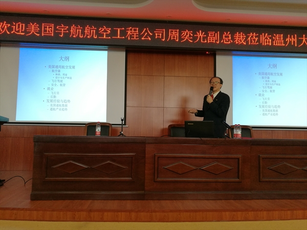 王永虎教授参与该活动(相片1)。周副总裁在题为《美国通用航空产业发展现状与趋势》的主旨演讲中以美国通用航空发展为借鉴,介绍通用航空器种类、各种类用途、设计与生产制造、飞行驾驶维修、航管与安检证照等内容,以及航空领域就业情况和美国航空产业发展经验与趋势等。