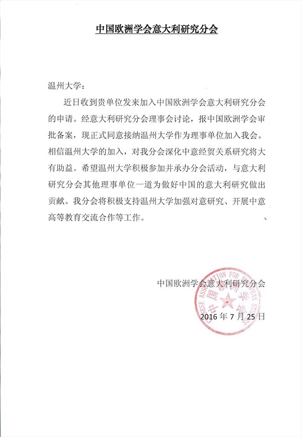 7月25日,温州大学作为理事单位正式加入中国欧洲学会意大利研究分会,未来将积极参与意大利研究分会的研究交流工作。
