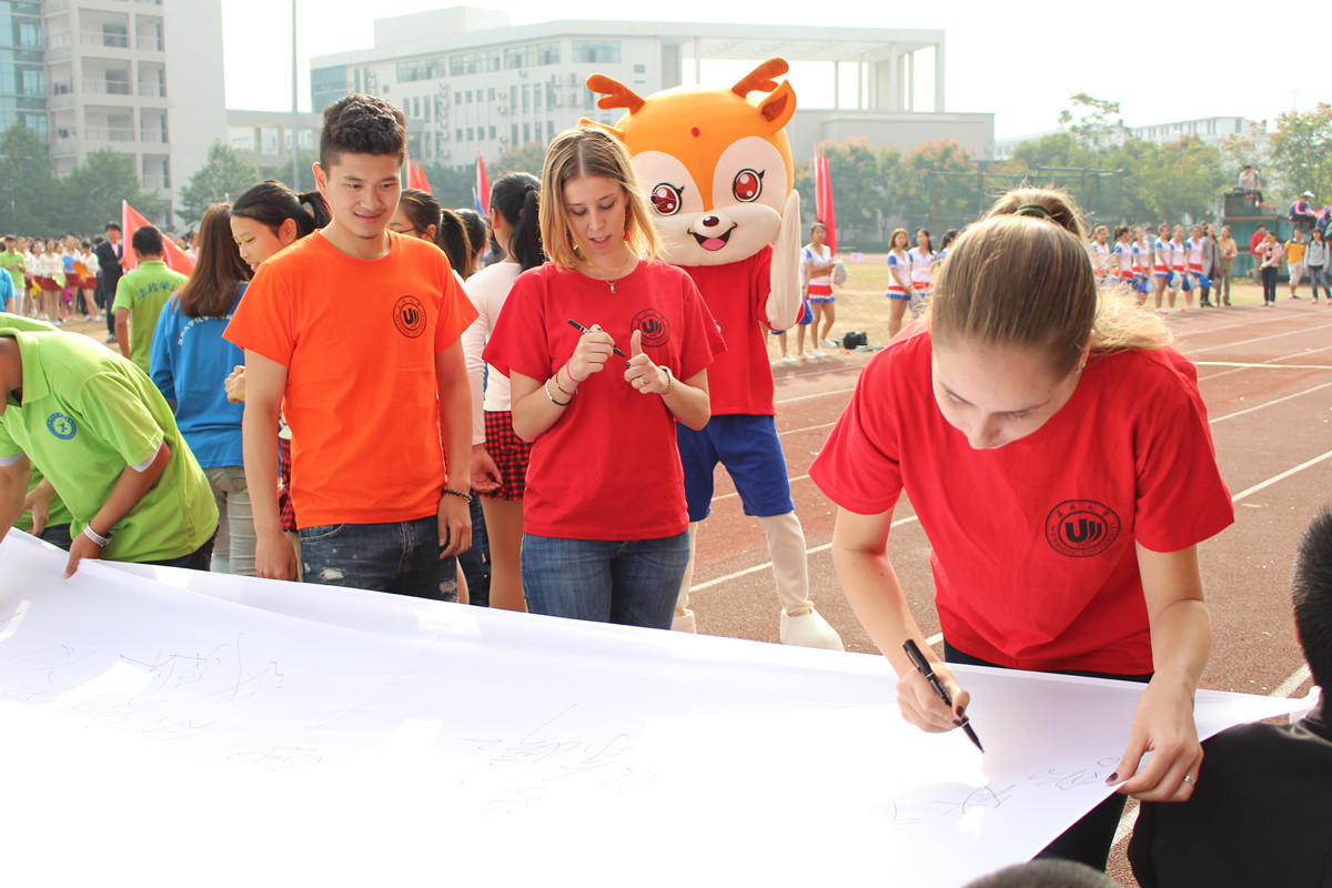 图为中外学生运动员在大运会倒计时启动仪式上签下郑重一笔