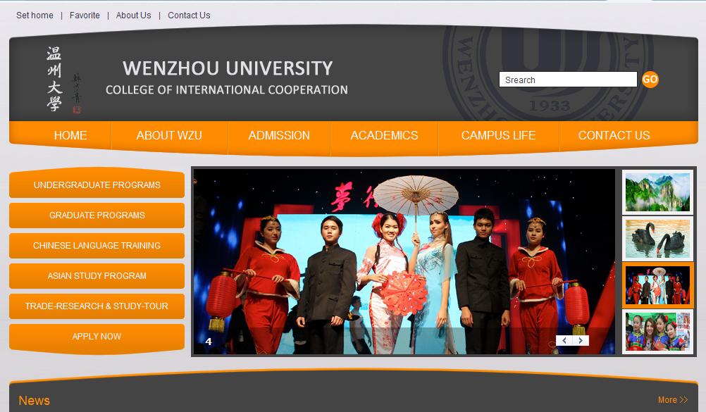 温州大学留学生网站是温州大学面向全球展示温大风采的全英文二级网站,是向海外学子传递信息的平台,是海外专家学者了解温大的窗口,同时,留学生网站的开通也有利于留学生服务和管理的规范化。