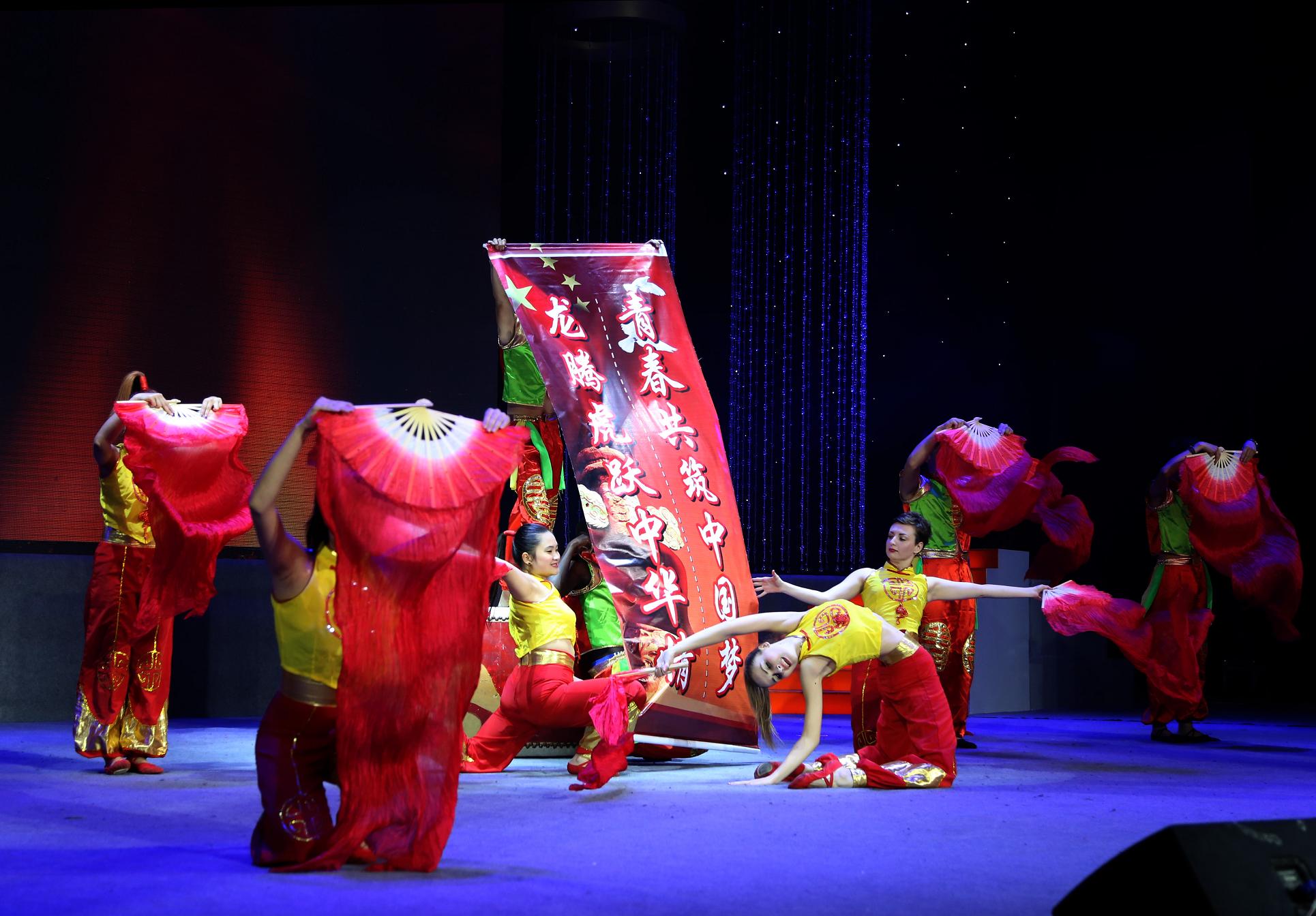 图为我校留学生表演舞蹈《龙腾虎跃》