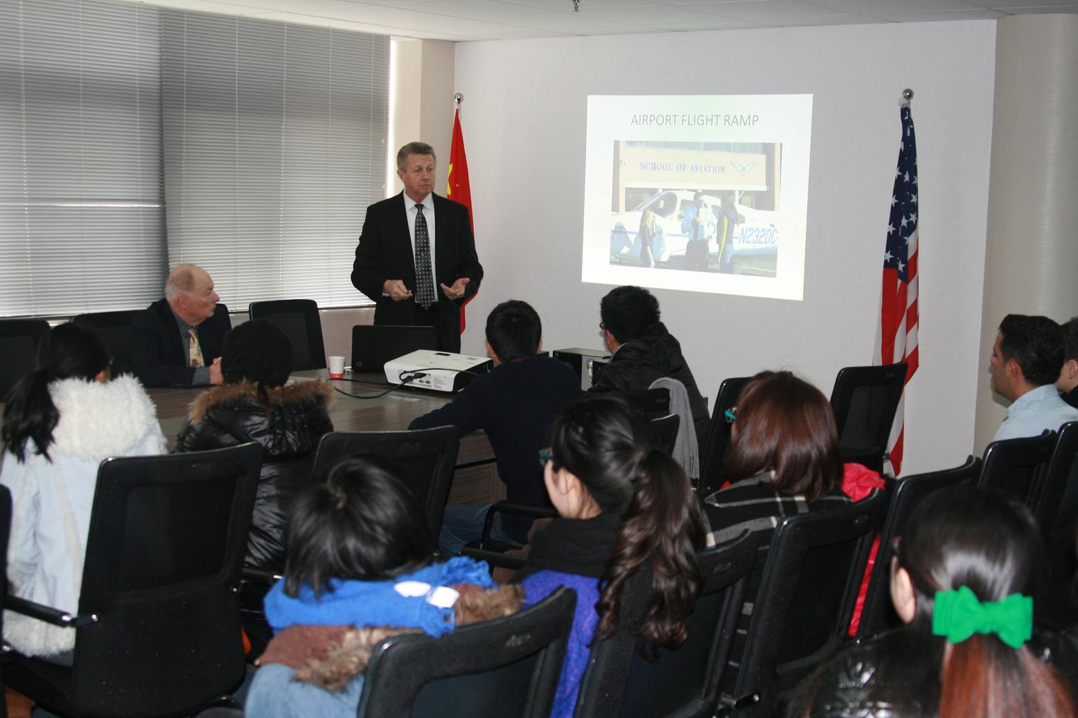 为促进低空飞行领域开发、满足市民对私人航天飞行的需求,通过航空港建设带动相关产业及其创新,进而刺激温州经济发展,此次温州大学特邀美国著名的航空学校道林大学前来访问。副院长 Thomas Daly与航空飞行教授James Record向我校师生们展示了其数十年从事飞行和飞行教学的经历,美国道林大学优越的教学环境(包括学校机场),并告诉学生们如何达成梦想。两位教授的介绍让在座的师生不禁流露出惊奇与羡艳,并在其后争相恳请签名、合影留念。