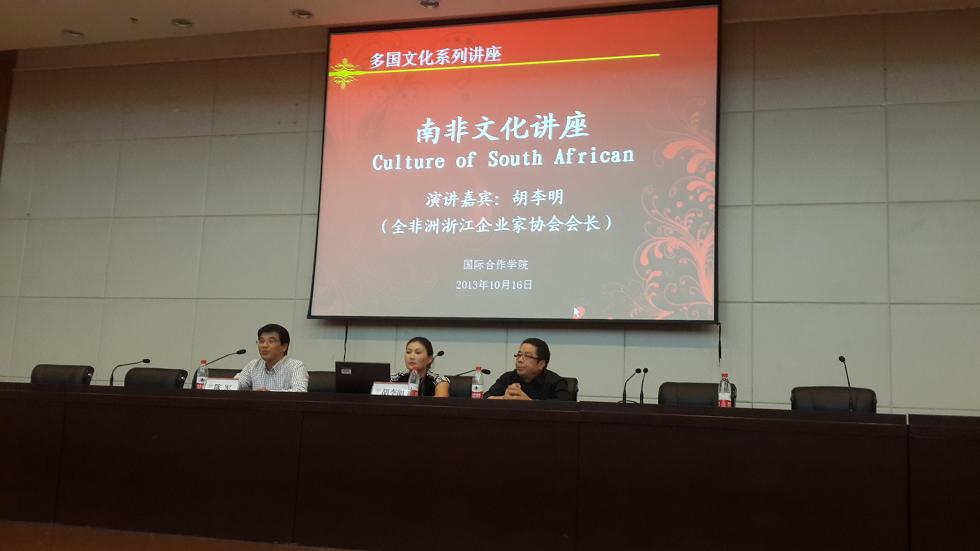 特邀温州大学客座教授,全非洲浙江企业家协会会长、南非胡氏集团董事长、中国人民政治协商会议温州市委员会海外委员、浙江省政协港澳台侨委员会特邀委员、中央统战部中非商会常务理事胡李明先生来校与大学生分享南非文化之旅。院长严晓鹏,副院长陈军全程参与了此次讲座。