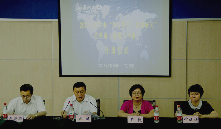 开班仪式由严晓鹏院长主持。温州大学副校长薛伟致辞。他首先代表学校对欧美华文教师的到来表示热烈欢迎,肯定了华文教育在弘扬中华文化、促进祖国统一方面的重要意义,并简要介绍了温州大学近年来开展国际交流与华文教育工作取得的成绩,希望通过本次研习班,使参加培训的华文教师在汉语教学水平上得到较大提高,推动海外华文教育的发展。