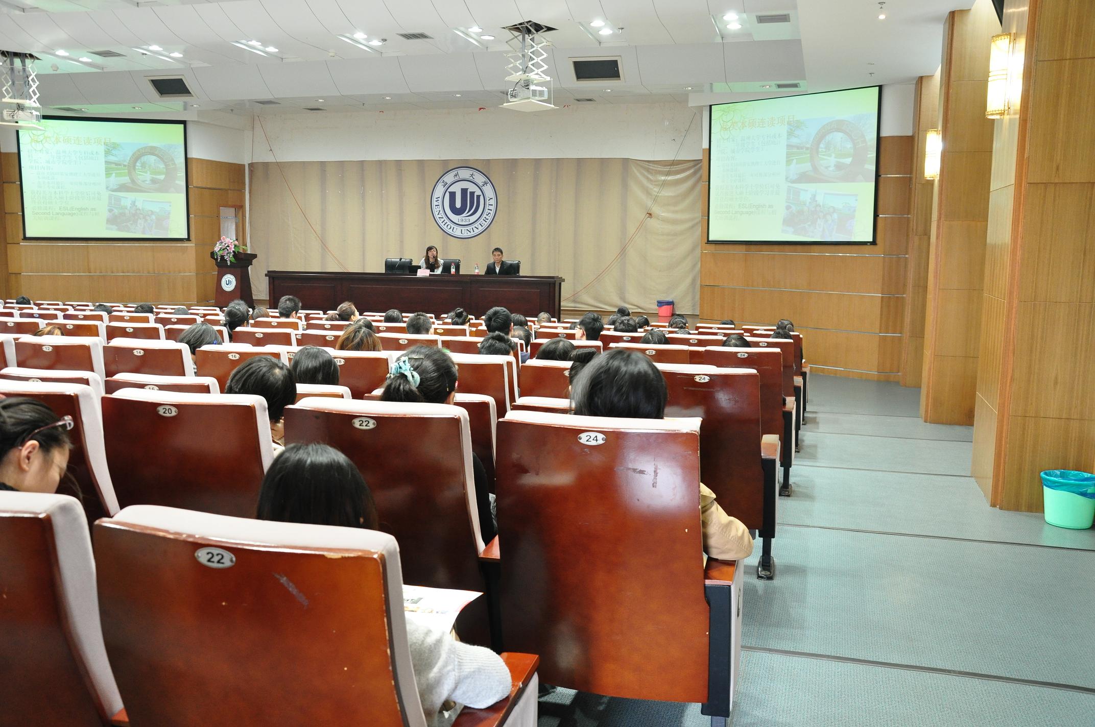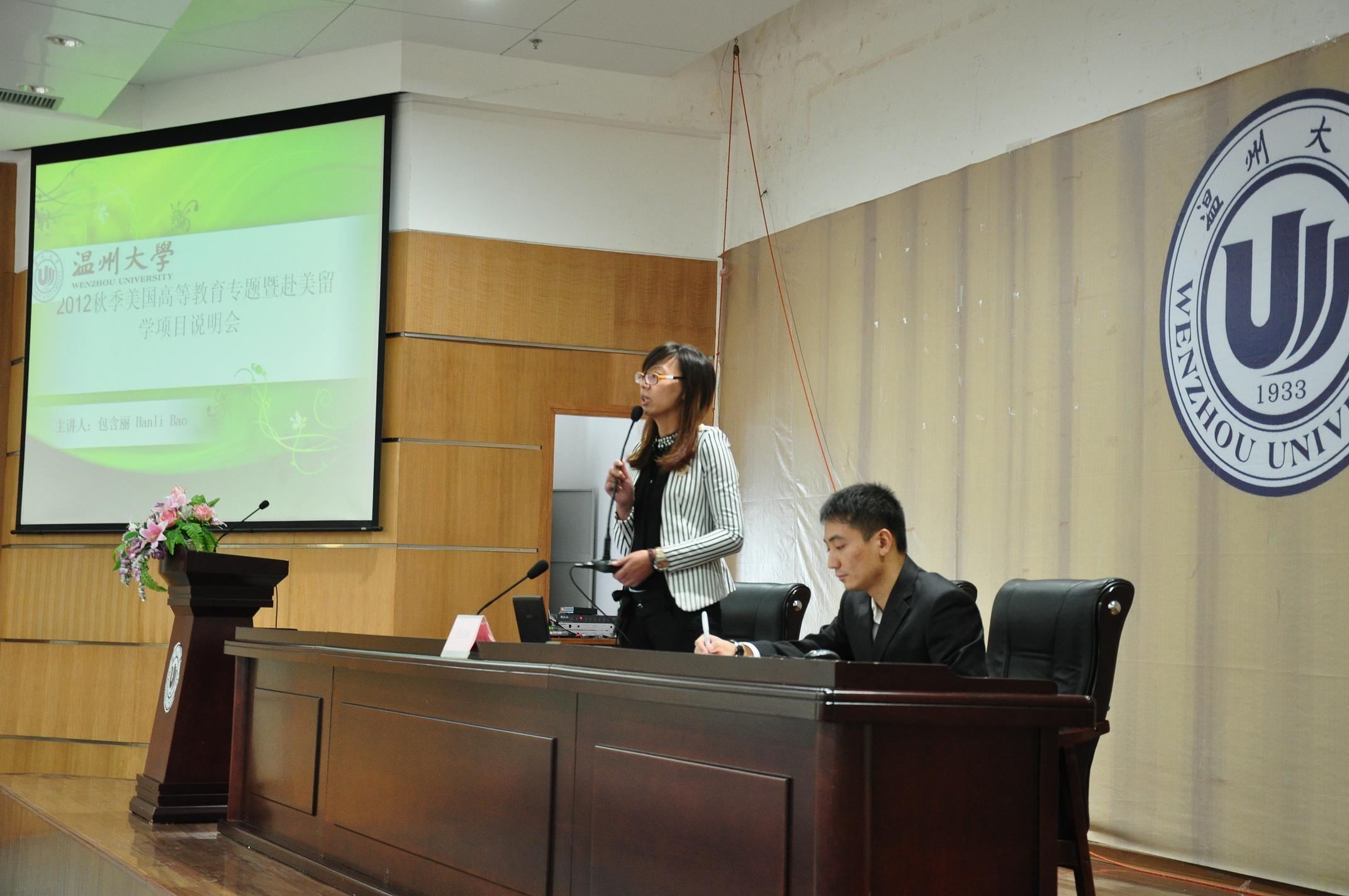 报告厅召开 “2012秋季温州大学美国高等教育专题暨赴美留学项目说明会”。说明会由国际合作项目开发办公室主任、美国印第安纳访问学者包含丽老师主讲。
