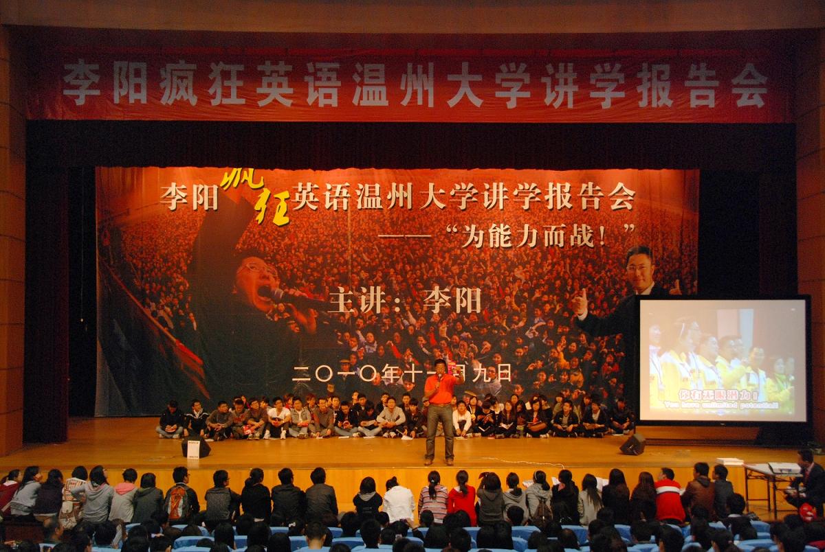 主办,温州大学特聘李阳老师担任客座教授。疯狂英语在中国可谓家喻户晓,“李阳疯狂英语”传播的不仅仅是一种学习英语的方法,更传播着一种催人奋进的励志精神。本次讲座的主题是——为能力而战!