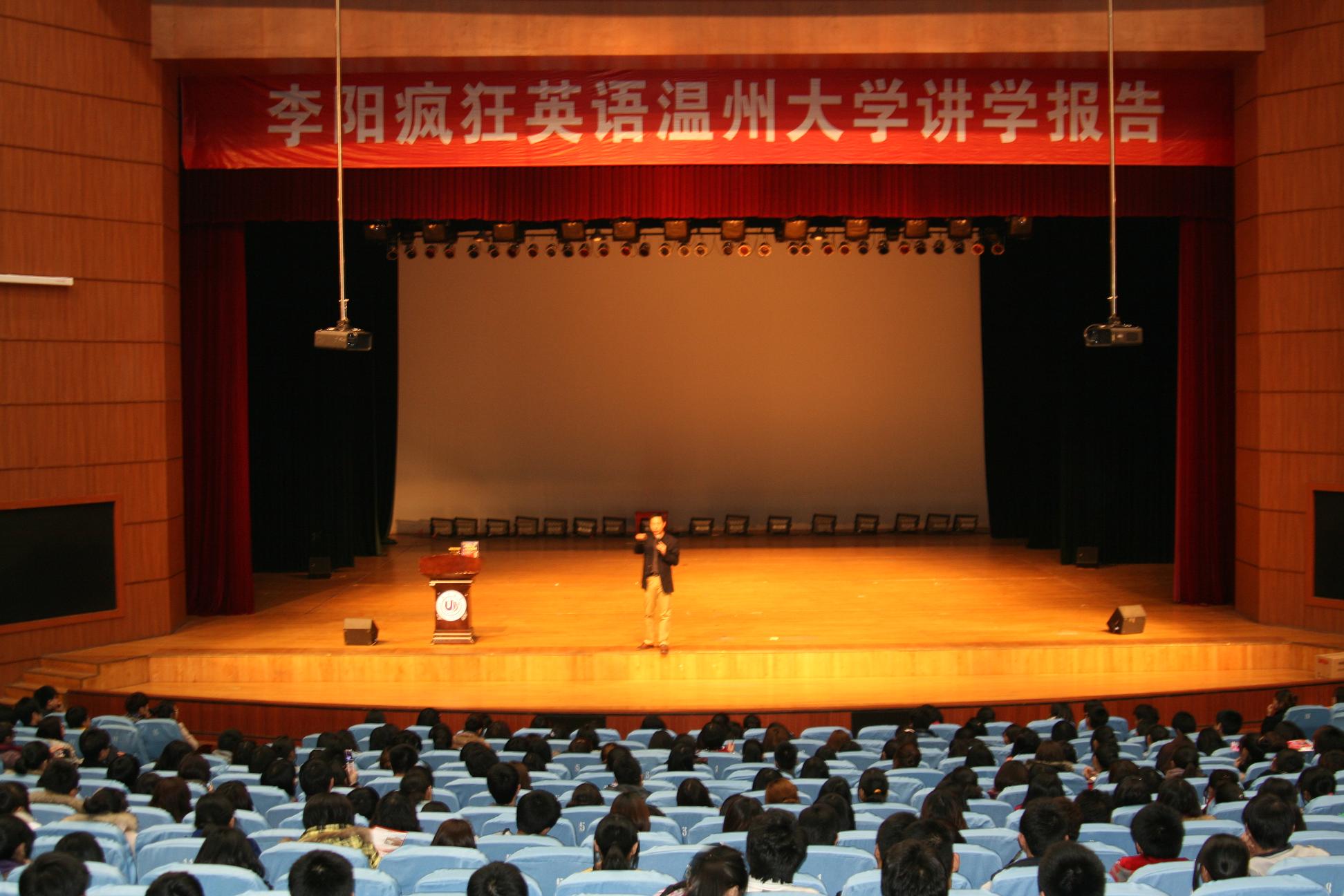 当晚,李阳疯狂英语团队的首席导师——周光耀一出场就引起了全场轰动,每个人都高举双手,热烈鼓掌。在他的带领下全场都陷入到了热爱英语的热潮,陷入到为英语而疯狂地步。在他的带领下全场温大学子的朗读声充斥着整个大厅,几乎每一个人都在尽自己的全力去为英语而战。同时,周光耀老师也用他独有的教学方法教会我们如何用疯子式的行动,来快速的提高自己的英文水平。在讲座的最后我们在他的带领下,以标准的发音结束了这次疯狂英语。