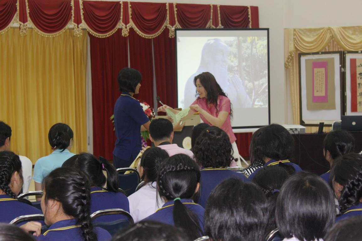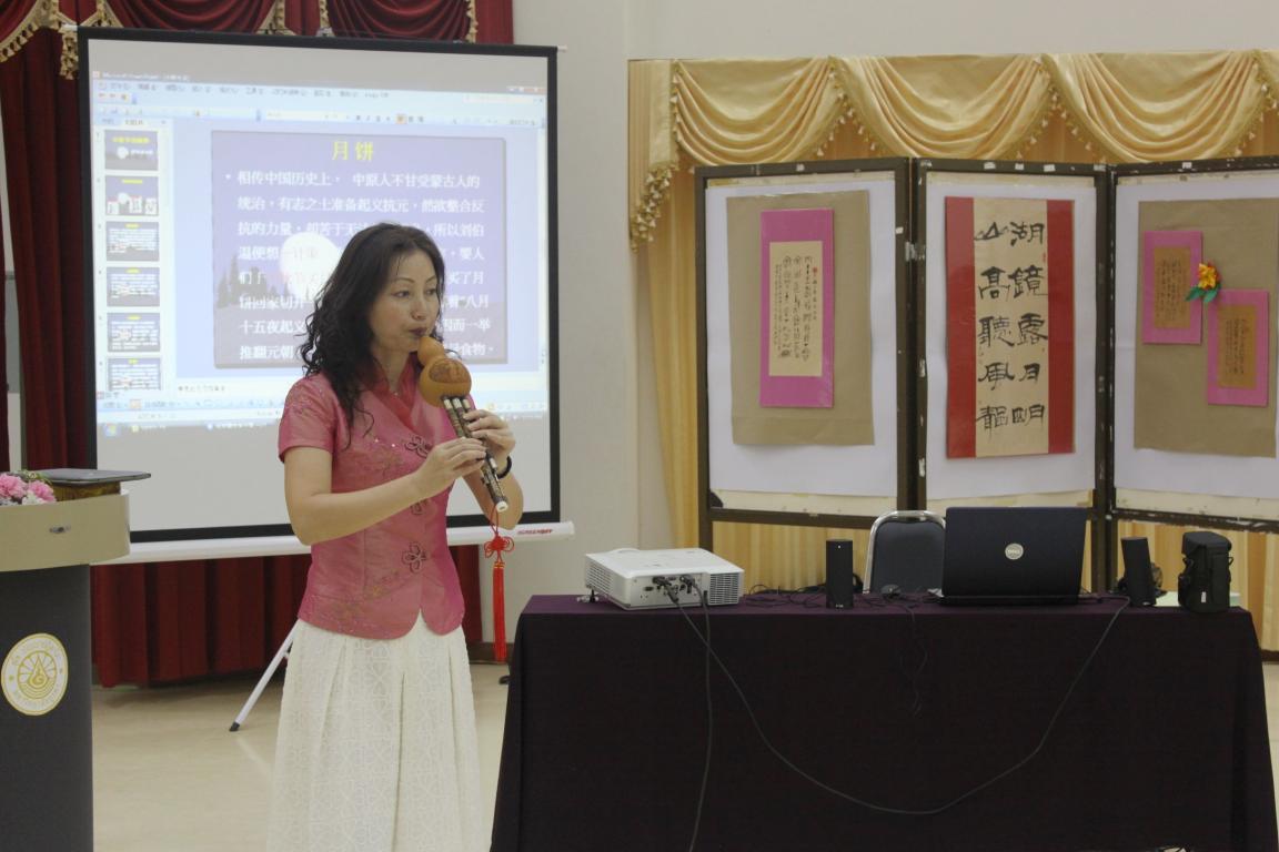 外派汉语教师张丽丽演奏了中国传统民乐并现场表演中国剪纸,志愿者老师林锦芝和欧阳潭演唱了中文歌曲,上海大学书法家徐步群老师现场进行了书法演示,均受到师生们的热烈欢迎。西亚怒颂中学的同学们也演唱了他们准备的中文歌曲,接受了孔院赠予的小礼物。整个现场中泰师生的互动气氛欢快热烈,大家一边品尝月饼,一边观看表演和展出,感受中国文化的熏陶和浸润,加深了对中国以及中国文化的理解和喜爱。西亚怒颂中学的中文部负责人张亚佳老师说:孔院的文化活动不仅开拓了学生视野,而且提高了学生学习汉语的兴趣和热情。她还表示特别希望能够在汉语教学、HSK汉语水平考试以及中国文化传播等方面与孔院有更多更广泛的合作。本次活动扩大了孔院在泰国东部的影响,使更多的学生了解汉语和中国文化,起到了很好的辐射作用,为孔院工作的进一步开展打下良好的基础。