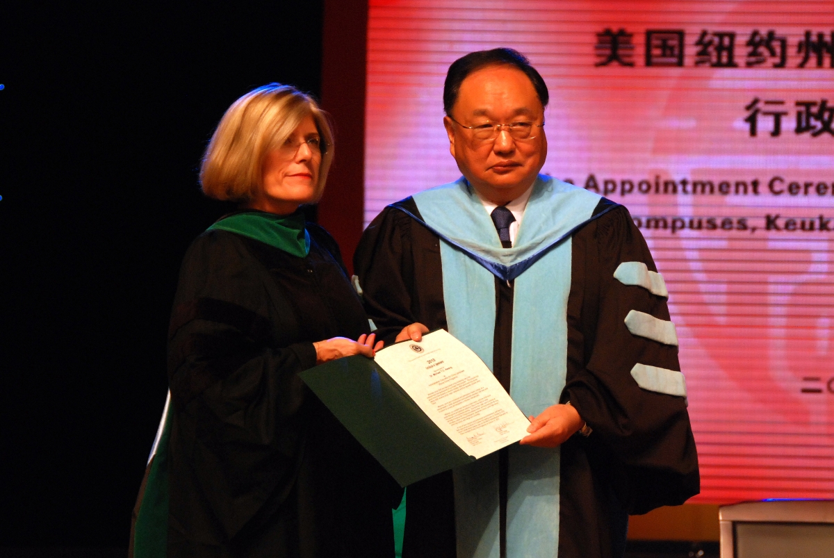 晚会之前进行了简短的“黄天中博士荣升为美国纽约州库克大学中国校区行政校长的任命仪式”,库克大学董事长Melissa Brown博士、库克大学校长Joseph Burke博士亲自为黄天中博士颁发了任命书。颁发任命书完毕后,黄天中校长发表了就任感言。他先进的教育理念受到台下千名师生阵阵掌声。他说,人不能只看一次的成绩,一次的失败不等于永远的失败。曾几何时,他并不是大学里面最优秀的,母亲的一句话让他备受鼓舞,他有自己的奋斗目标,而且他一直在向这个目标努力着。现在,身为人父的他,用同样的方法培育出了优秀的子女。“别看我一时,且看我一世”的理念在同学们的脑海中回荡不惜,相信,那必将激励更多的同学向自己的目标去不懈努力。