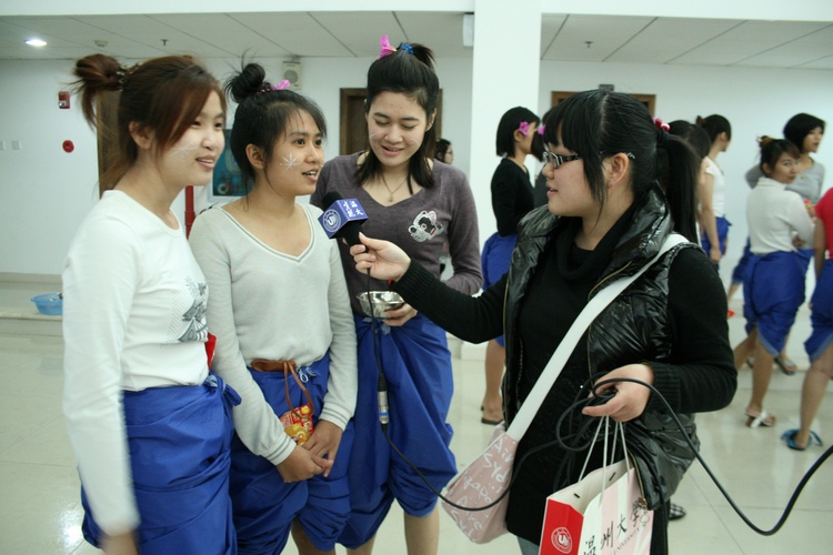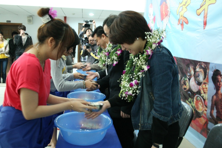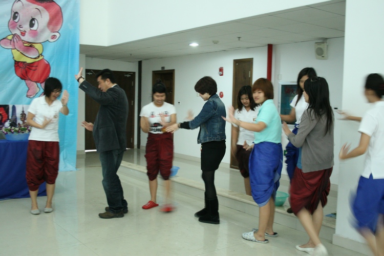 活动中,身着泰国传统服饰的留学生向老师行洒水礼,把象征尊敬和感恩的“圣水”洒到老师的手中,接到“圣水”的长辈把象征祝福的中国结交到学生的手中,祝愿学生在温大顺利完成学业,在新的一年里健康成长。为了节约用水,泰国留学生把泼水改成洒水,用手指沾上水,互相往对方身上轻洒,互相在脸上抹上代表友好的白色粉未,互相送祝福。伴着婉转动听的泰国音乐,泰国留学生跳起了传统的民族舞蹈,并邀请老师、其他国家留学生、中国学生加入,大家玩的不亦乐乎,现场响起了一阵阵友好的欢笑声。